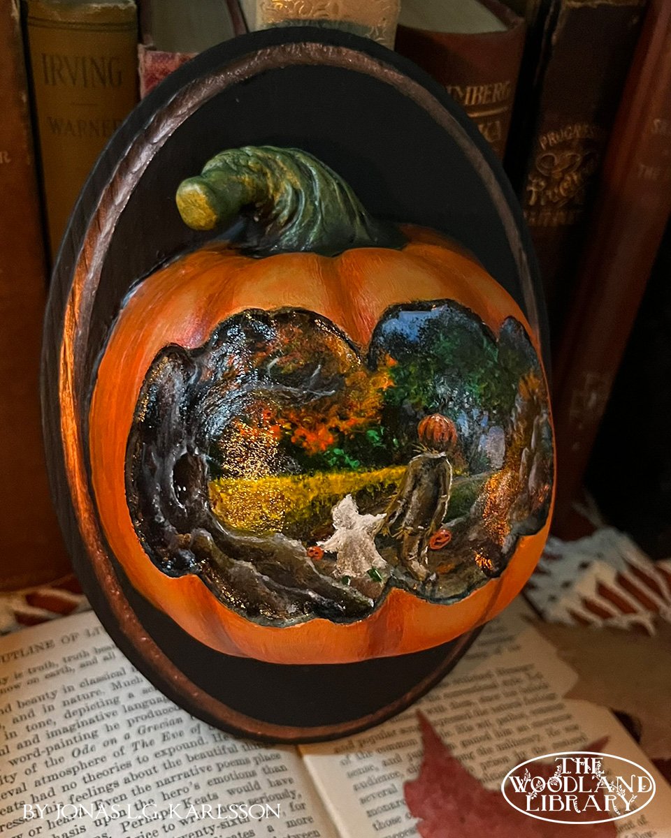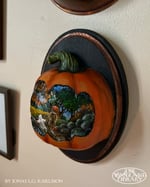 "Trick or Treat" Unique Acrylic Painting on a Pumpkin mounted on an oval wood board, ready to hang.